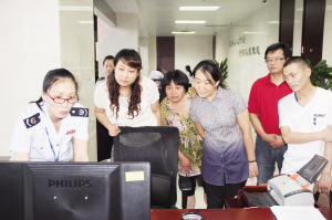 國(guó)稅工作人員向納稅人代表演示納稅申報(bào)流程。