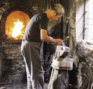 打鐵既是一個(gè)技術(shù)活,更是一件體力活。“打鐵還需趁熱”,鐵塊在火爐里燒得通紅后,要迅速拿出來(lái)捶打,稍微一涼就打不動(dòng)了。在操作間,老歐需要在爐子邊反復(fù)灼、敲打,夏天熱得讓人受不了;刀具還需水磨,三九天徒手浸在冰涼的水里,寒冷刺骨。
