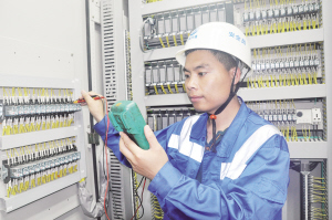 在距離地面50米高的鐵房子里,時而測量配電柜、錯綜復雜線路的電流電壓,時而檢查電動機、各種傳動裝置的運行情況。記者近日來到太倉正和碼頭有限公司采訪,看到安全保障部副經(jīng)理王永春正在給一臺岸橋檢查“心臟”。