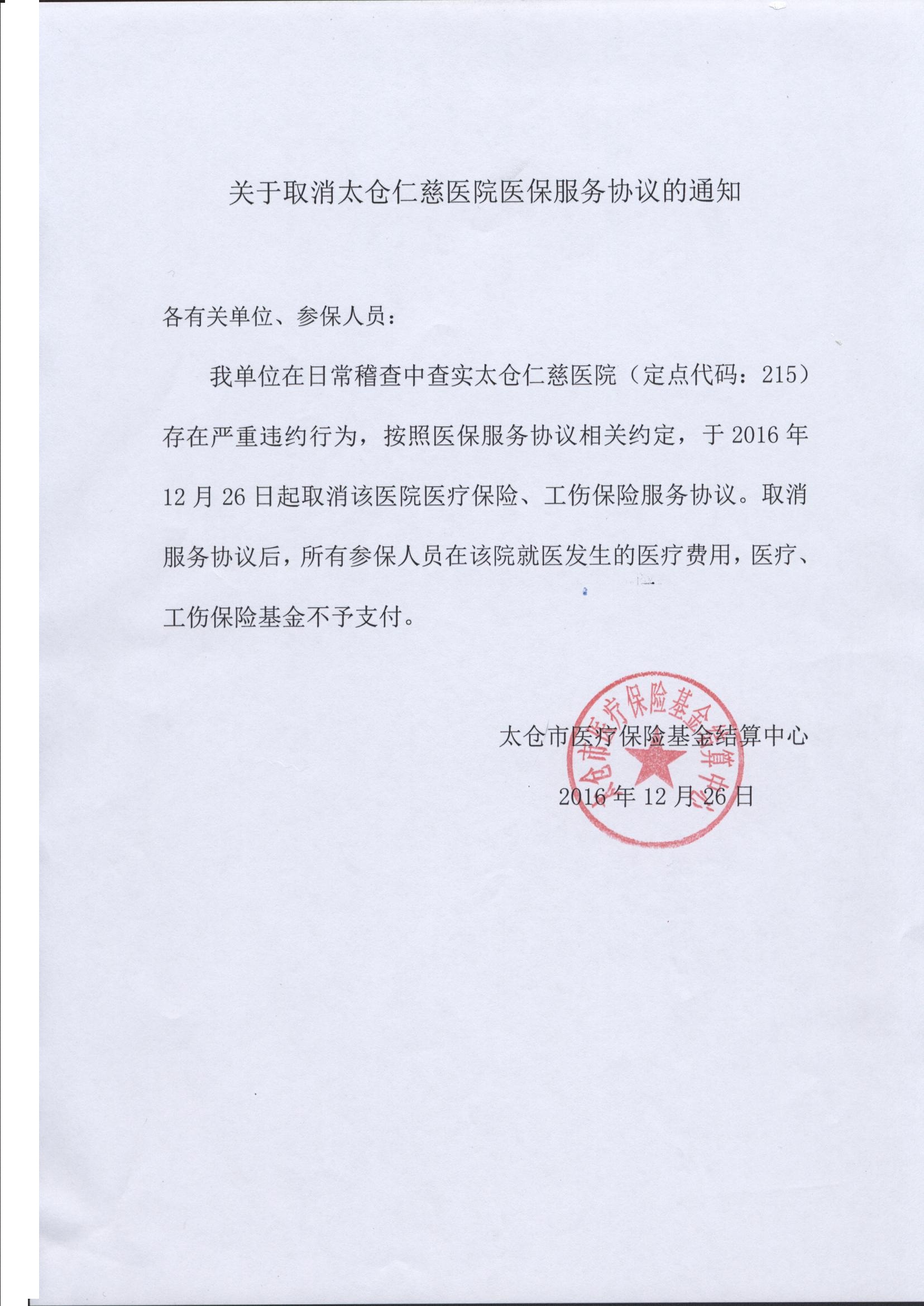 我單位在日?;橹胁閷?shí)太倉仁慈醫(yī)院(定點(diǎn)代碼:215)存在嚴(yán)重違約行為,按照醫(yī)保服務(wù)協(xié)議相關(guān)約定,于2016年12月26日起取消該醫(yī)院醫(yī)療保險、工傷保險服務(wù)協(xié)議。取消服務(wù)協(xié)議后,所有參保人員在該院就醫(yī)發(fā)生的醫(yī)療費(fèi)用,醫(yī)療、工傷保險基金不予支付。