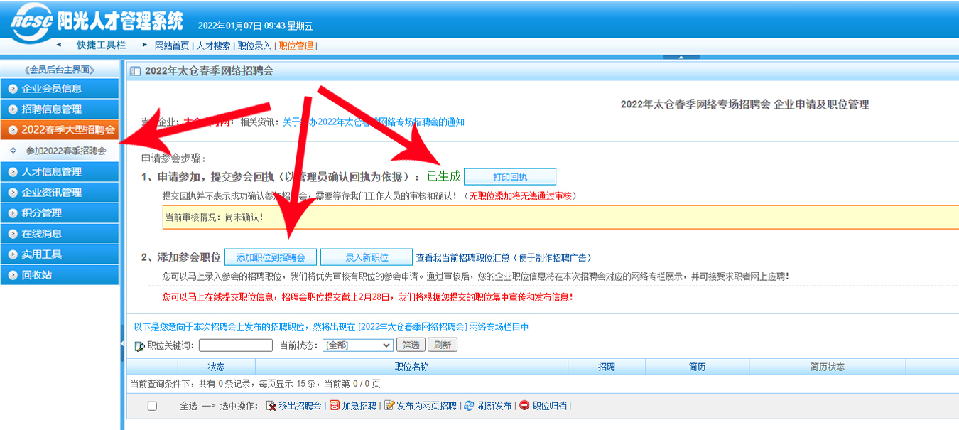 單位報(bào)名自2022年1月7日起,通過太倉(cāng)人才網(wǎng)“2022春季網(wǎng)上招聘會(huì)”專欄添加職位即視作報(bào)名參加。2022年2月28日前提交通過審核的企業(yè)。