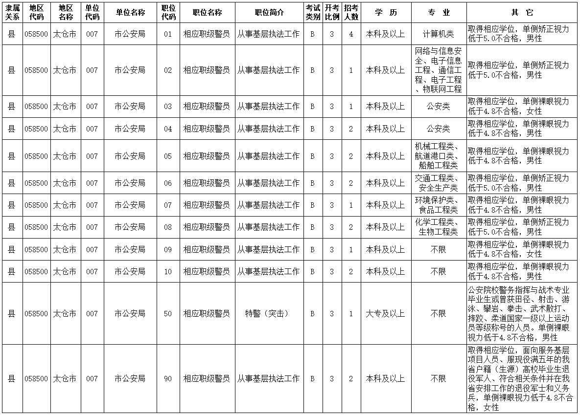 江蘇省2026年度考試錄用公務(wù)員公告發(fā)布,如果你有一個(gè)熱血的警察夢(mèng),想穿上警服書寫藏藍(lán)人生。太倉(cāng)市公安局12個(gè)崗位、21個(gè)名額期待你的加入! 一、招錄職位信息 點(diǎn)擊圖片放大 三、報(bào)名時(shí)間 2025年11月4日9:00至11月10日16:00 四、繳費(fèi)時(shí)間 2025年11月4日9:00至11月13日16:00 、筆試時(shí)間 公安專業(yè)科目筆試時(shí)間 2025年12月6日 下午 14:00-16:00 ...